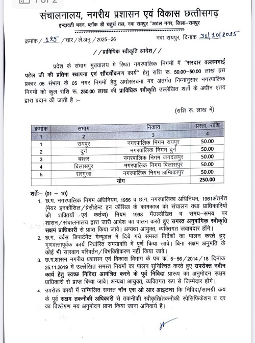 जारी आदेश के अनुसार, यह राशि प्रत्येक नगर निगम को “सरदार वल्लभभाई पटेल जी की प्रतिमा स्थापना एवं सौंदर्यीकरण कार्य” के लिए दी जा रही है। आदेश में यह भी स्पष्ट किया गया है कि कार्य छत्तीसगढ़ नगरपालिका अधिनियम 1961 और नगरपालिक निगम अधिनियम 1956 के प्रावधानों के अनुरूप किया जाएगा।