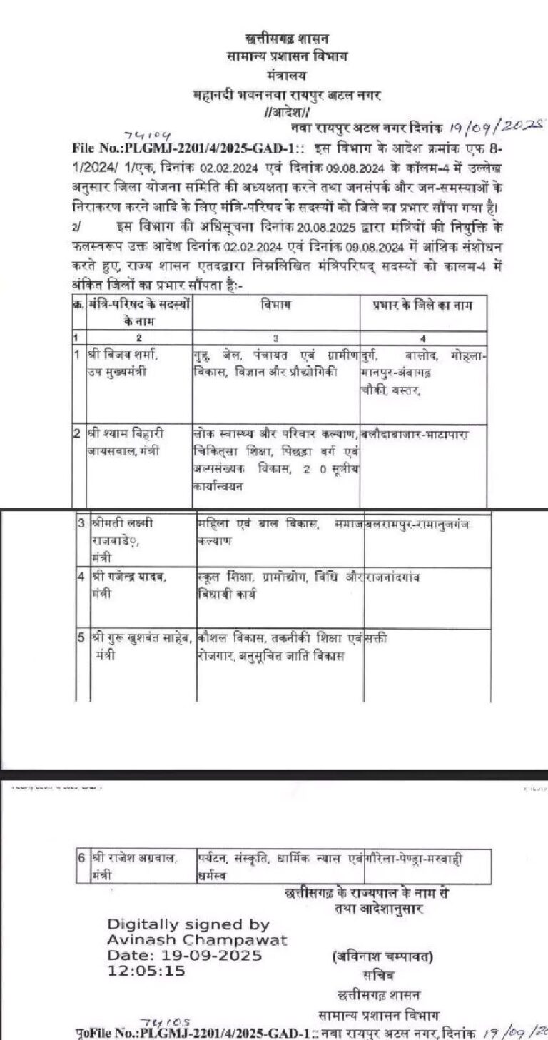 छत्तीसगढ़ में मंत्रियों के प्रभार में फेरबदल, नए मंत्री बनने के चलते ह : छत्तीसगढ़ में मंत्रियों के प्रभार में फेरबदल, नए मंत्री बनने के चलते हुआ जिलों के प्रभार में बदलाव, देखें लिस्ट…