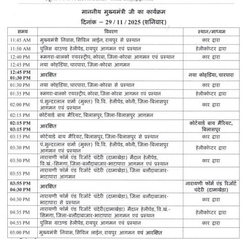 इसके बाद वे कोरबा से बिलासपुर जिले के लिए रवाना होंगे।यहां भी सीएम साय निजी कार्यक्रम में शिरकत करेंगे। इसी तरह बलौदाबाजार में भी एक निजी कार्यक्रम में शामिल होंगे और शाम 5 बजे वापस मुख्यमंत्री निवास लौट आएंगे।