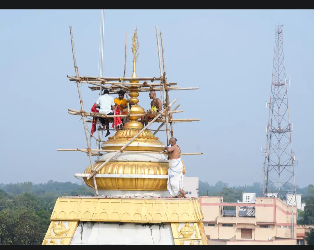 उज्जैन इस्कॉन मंदिर पर स्वर्ण-चक्र की प्रतिष्ठा : मंदिर शिखर पर लगा 20 किलो का सुदर्शन चक्र, पूजा-अनुष्ठान के साथ स्थापना