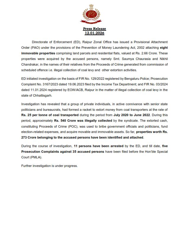ED ने सौम्या चौरसिया समेत अन्य आरोपियों की : 2.66 करोड़ की 8 अचल संपत्तियां को किया अटैच